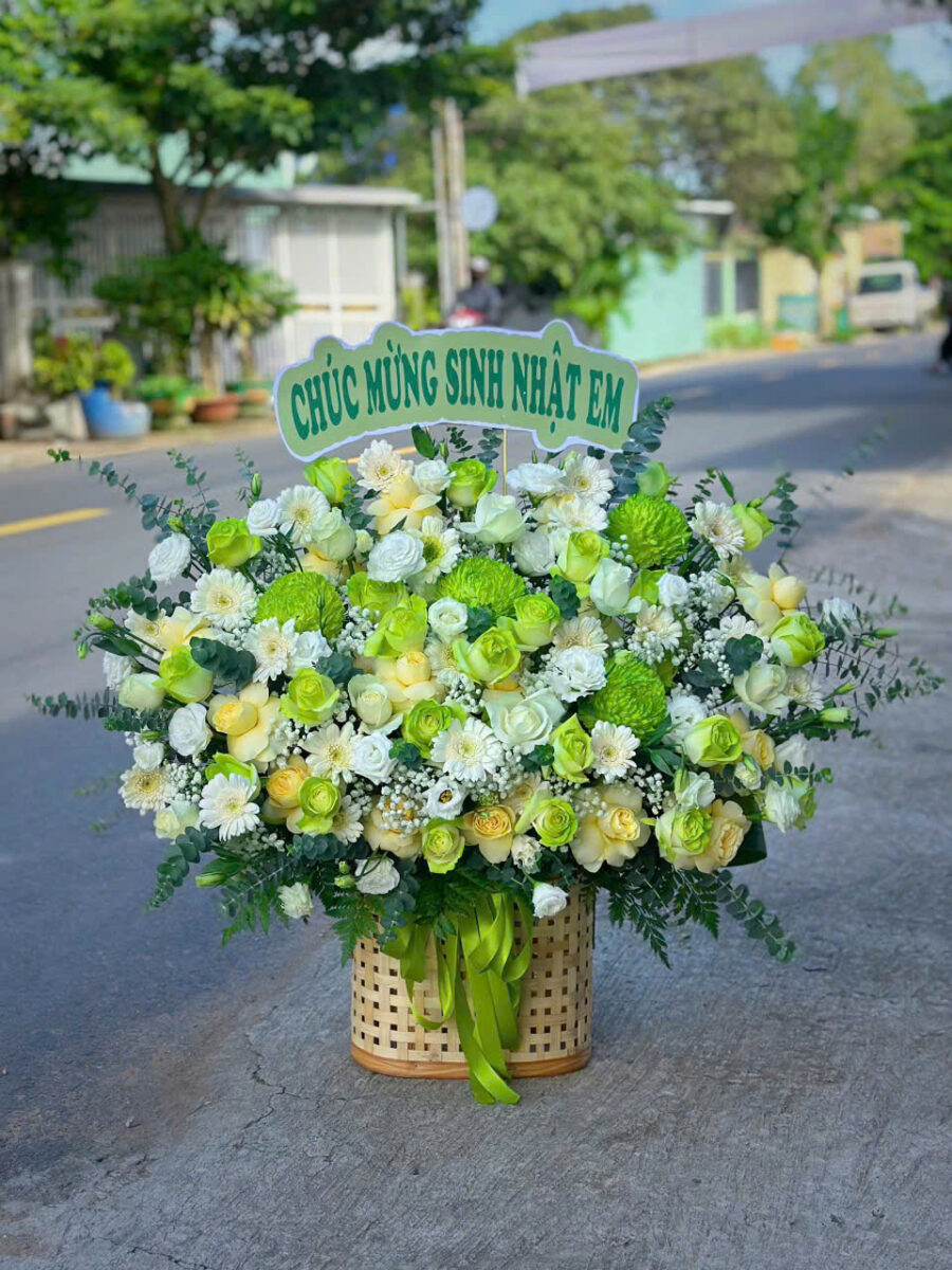 Giỏ hoa sinh nhật xanh trắng mang phong cách thanh lịch và tươi mới, được kết hợp hài hòa giữa những đóa hồng trắng, hồng xanh cùng các loài hoa phụ tinh tế. Sắc trắng tinh khôi hòa quyện với gam xanh mát mắt, tượng trưng cho sự an lành, may mắn và lời chúc tốt đẹp. Đây là món quà ý nghĩa để gửi tặng người thân, bạn bè hay đồng nghiệp trong ngày sinh nhật, chắc chắn sẽ mang lại niềm vui và bất ngờ cho người nhận.